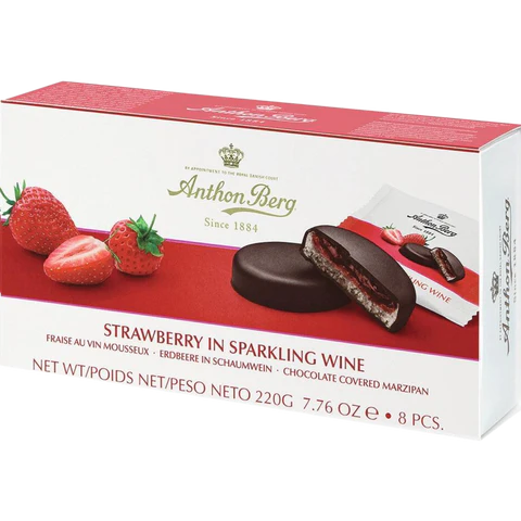 Anthon Berg - אנטון ברג שוקולד מריר ממולא מרציפן ותות ביין מבעבע 220g