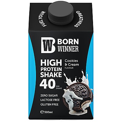 משקה חלבון איכותי של Born Winner בטעם עוגיות ושמנת אהוב וקלאסי.מכיל 40 גרם חלבון לבקבוק, ללא תוספת סוכר, ללא לקטוז וללא גלוטן – אידיאלי לאחר אימון, כהשלמת חלבון יומית או כארוחה קלה ומשביעה.מוכן לשתייה, במרקם קרמי ובטעם עשיר של עוגיות ושמנת.