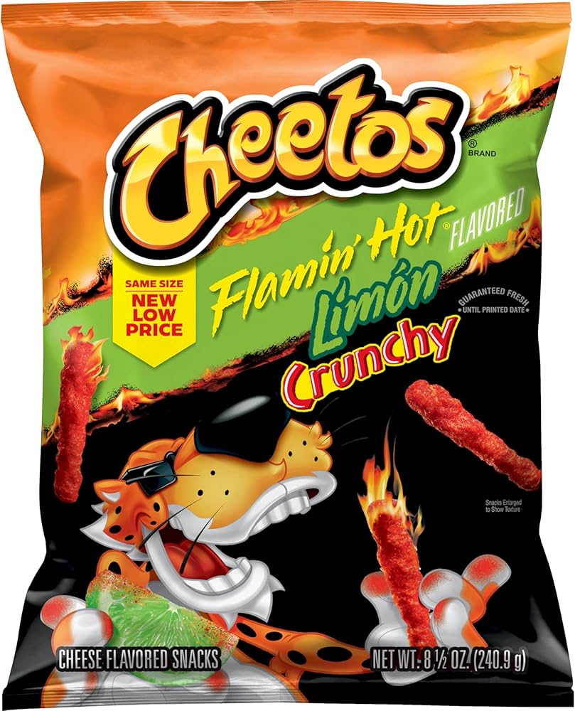 Cheetos Crunchy Flamin’ Hot Limón מביא חוויית נשנוש עוצמתית במיוחד עם שילוב ייחודי של חריפות חזקה וטוויסט לימוני מרענן.המרקם הקריספי המוכר של צ׳יטוס יחד עם תיבול Flamin’ Hot ולימון יוצרים איזון מושלם בין חריף, חמוץ וקראנצ’י – בדיוק מה שאוהבי חטיפים מחפשים.