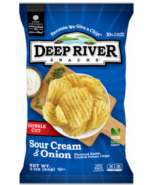 צ'יפס בוטיק אמריקאי איכותי בטעם שמנת חמוצה ובצל מפנק. מבושל בשמן חמניות טבעי, ללא גלוטן. מותג Deep River Snacks הידוע באיכותו הגבוהה ובטעמים הייחודיים