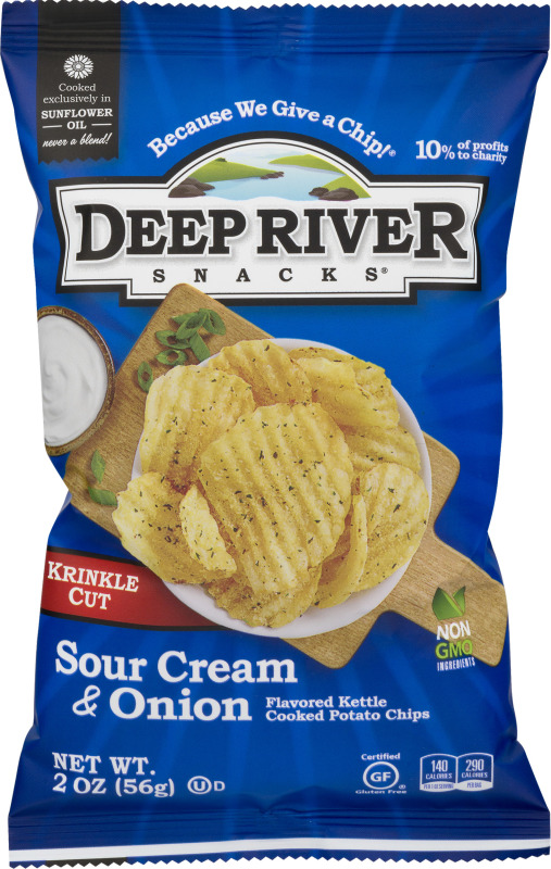 צ'יפס בוטיק אמריקאי איכותי בטעם שמנת חמוצה ובצל מפנק. מבושל בשמן חמניות טבעי, ללא גלוטן. מותג Deep River Snacks הידוע באיכותו הגבוהה ובטעמים הייחודיים
