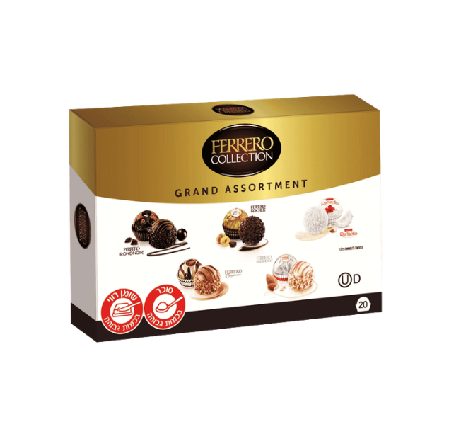 פררו רושה קולקשן – מארז יוקרתי ומגוון! קופסה מהודרת המכילה 20 פרלינים איכותיים ממשפחת פררו: פררו רושה הקלאסי, רפאלו בקוקוס לבן, רונדנואר בשוקולד מריר ורפאלו קראנצ'י בקרמל ופריכיות אורז. כל פרלין עטוף בנפרד לשמירה על הטריות והטעם. מתנה מושלמת לחגים, אירועים ומועדים מיוחדים. חלבי. משקל: 172 גרם.