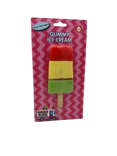 GUMMY ICE CREAM - ארטיק גומי מקורי ומושך בעיצוב של אסקימו תלת-צבעוני על מקל! הגומי מגיע בצורה מציאותית של ארטיק קפוא עם שלושה שכבות צבע יפהפיות - אדום, צהוב וירוק - על מקל עץ אמיתי.