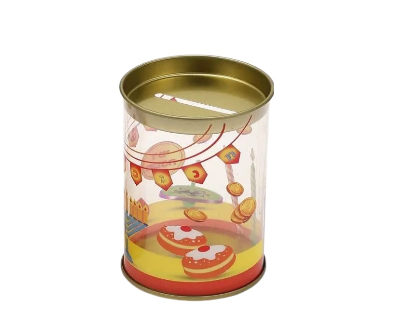 קופת צדקה מעוצבת ומיוחדת לחג החנוכה, עשויה מפח איכותי עם עיצוב חגיגי צבעוני. הקופה מעוצבת בגוונים של זהב, אדום וצהוב, עם איורים של סביבונים וסופגניות ומטבעות זהב נופלים. מכסה זהוב מבריק בחלק העליון עם חריץ להכנסת מטבעות. מוצר מושלם לעודד צדקה במהלך חג החנוכה, לקישוט הבית, למתנה, או להצבה על השולחן בזמן הדלקת נרות. משלב עיצוב יפהפה עם מסר חשוב של נתינה וצדקה.