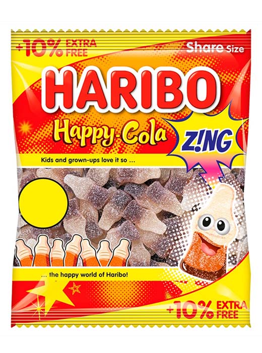 Haribo Happy Cola Zing 154g כולל ממתקי גומי בצורת בקבוקי קולה, עם שילוב של טעם קולה קלאסי וציפוי סוכר, המאפיין את גרסת Zing של סדרת Happy Cola.