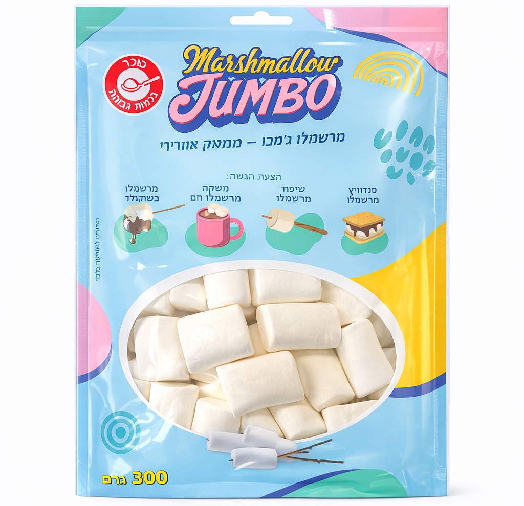 מרשמלו ג'מבו איכותי במרקם רך ואוורירי במיוחד, בגודל מושלם לשימושים מגוונים.מתאים להוספה לשוקו חם, להכנת סמורס, לקישוט קינוחים או פשוט לנשנוש מתוק וכיפי.