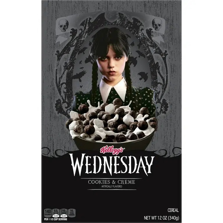 קורנפלקס במהדורה מיוחדת בהשראת Wednesday, עם שילוב מפנק של דגני בוקר פריכים בטעם עוגיות שוקולד וקרם וניל. חוויית בוקר מתוקה עם קראנץ’ מושלם, שמתאימה גם כחטיף נשנוש בכל שעה ביום. מושלם לחובבי עוגיות, קרם ולמעריצי הסדרה האייקונית.