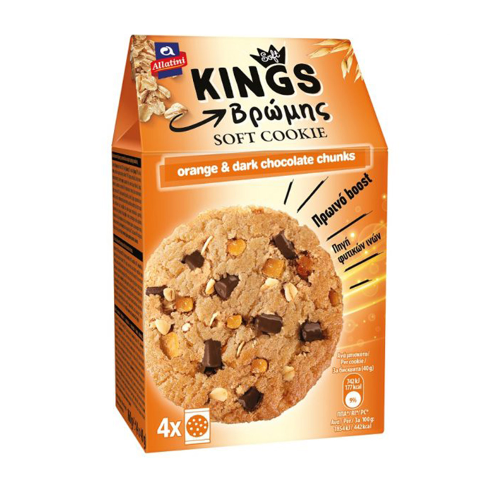 \nעוגיות קינגס הן עוגיות רכות איכותיות משיבולת שועל עם חתיכות תפוז וחתיכות שוקולד כהה שיוצרות חוויית טעם מרעננת ועשירה. כל עוגייה מכילה מרקם רך ועסיסי עם שיבולת שועל תזונתית וטעם תפוז טבעי הפזור בכל העוגייה.