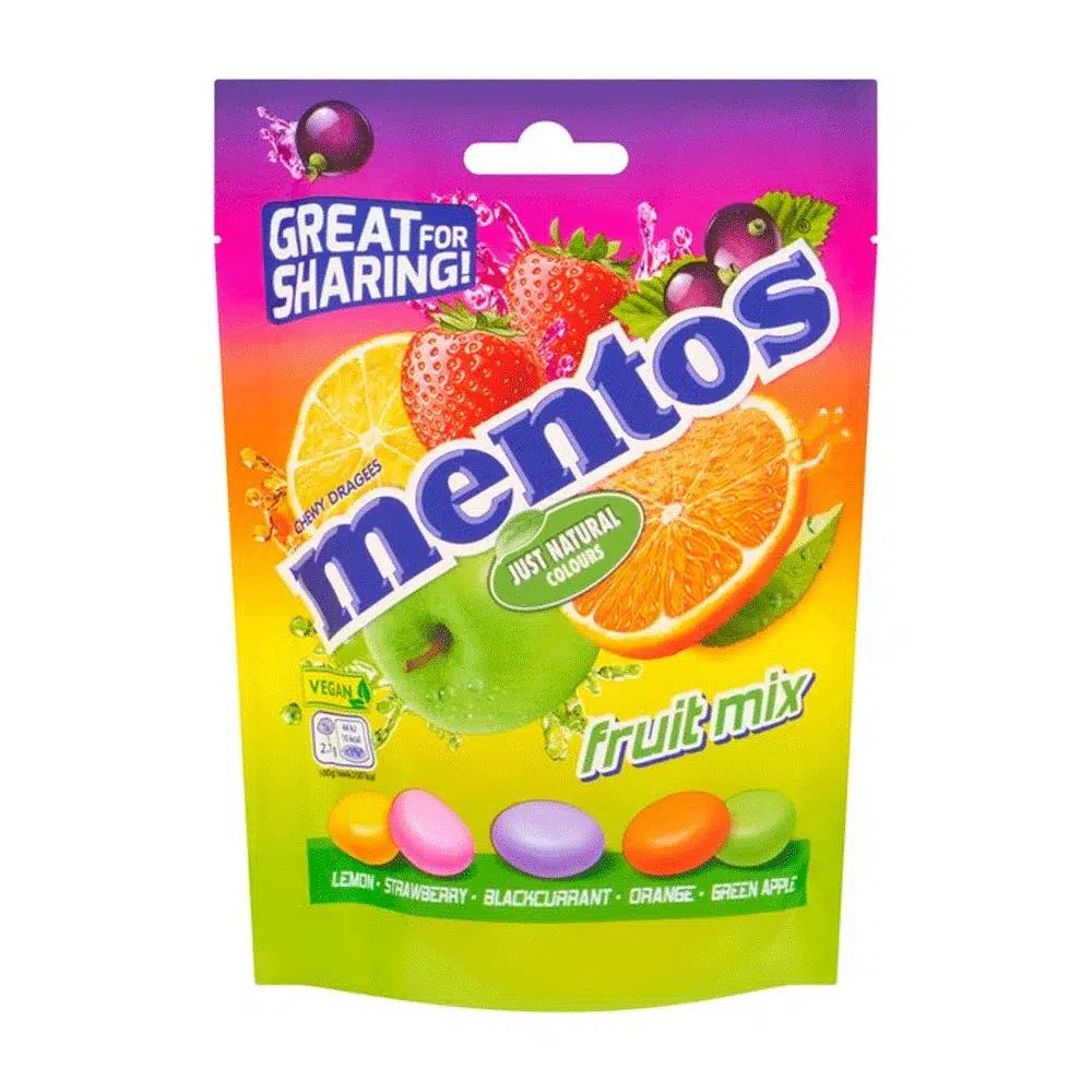 Mentos - סוכריות מנטוס בטעמי פירות טבעיים באריזת שיתוף נוחה. הסוכריות מגיעות בחמישה טעמים עשירים ומרעננים שמשלבים את הטעם הייחודי והמרקם הפריך של מנטוס עם טעמי פירות אהובים.