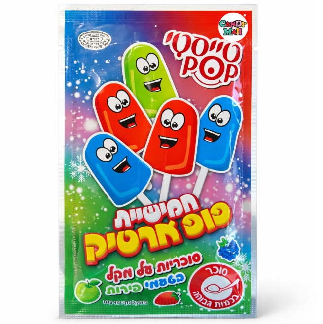 סוכריות על מקל בצורת ארטיקים צבעוניים בטעמי פירות מתוקים. ממתק מהנה ומשעשע בעיצוב אהוב על ילדים, מושלם למסיבות, לימי הולדת, הפתעות או כפינוק קטן וצבעוני. אריזה אישית ונוחה במשקל 15 גרם.