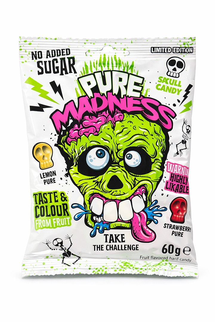 הסוכריות מסדרת Pure Madness סוכריות קשות ללא תוספת סוכר משלבות טעמי פרי טבעיים של לימון ותות ומעניקות תחושת רעננות בכל סוכרייה. האריזה הקטנה והנוחה מאפשרת לקחת אותן לכל מקום – לעבודה, ללימודים או לנסיעות.