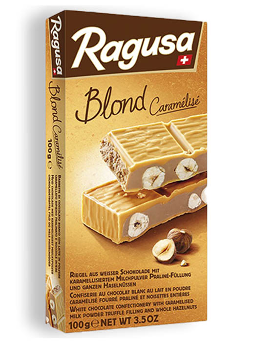 שוקולד לבן 29% במילוי טראפל אבקת חלב מקורמלת 62% ואגוזי לוז שלמים %