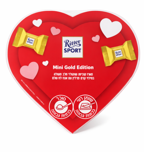 בונבוניירת שוקולד רומנטית בצורת לב מסדרת Mini Gold Edition של Ritter Sport. מכילה 16 שוקולדים אישיים משוקולד חלב במילוי קרם פרלין אגוזי לוז, עטופים בנפרד באריזת זהב יוקרתית. מתאימה במיוחד ליום האהבה, כמתנה מתוקה ומרשימה, מחווה רומנטית או תוספת מושלמת למארזי אהבה.