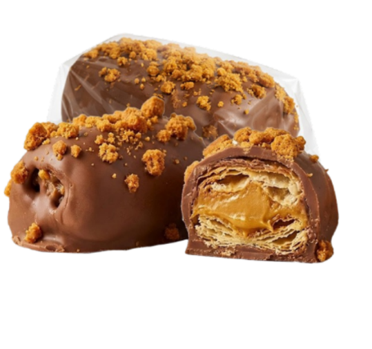 בקלאווה פריכה במילוי קרם ספוקולוס עשיר ומתובל בעדינות, מצופה שוקולד חלב חלק ומעוטרת בפירורי ביסקוויט קראנצ’יים. שילוב מושלם בין מתיקות קרמלית, תיבול חמים וטקסטורה מענגת בכל ביס. חוויית קינוח יוקרתית וממכרת.