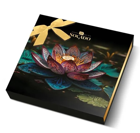 מארז פרלינים יוקרתי מבית Socado בעיצוב לוטוס מרהיב ואלגנטי. כולל מבחר שוקולדים איכותיים במילוי פרלינה עשיר, עם שילוב טעמים עדין ומפנק. האריזה המעוצבת בגימור שחור עם סרט זהב הופכת אותו למתנה מושלמת לכל אירוע או לפינוק אישי ברמה גבוהה.