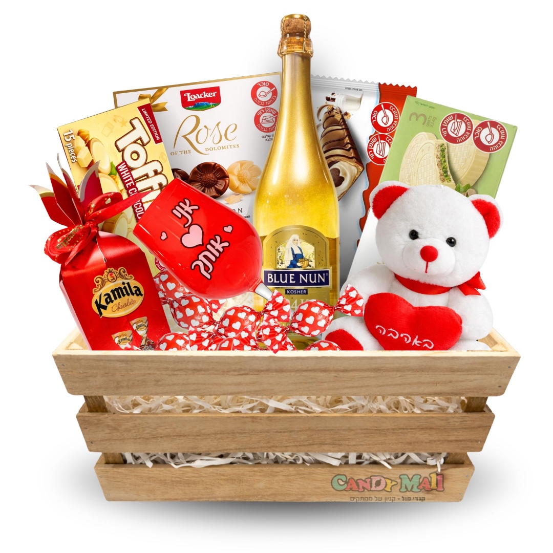 מארז יוקרתי ומרשים שמביא איתו את כל הקסם של יום האהבה.בקופסת עץ מעוצבת תמצאו שילוב מנצח של יין איכותי, שוקולדים מובחרים, ופינוקים מתוקים לצד דובי רך ומלא אהבה.המארז משלב טעמים קלאסיים ואהובים – שוקולדים אירופאים משובחים, וופלים מפנקים, מתוקים בציפוי לבבות וכוס אהבה חגיגית שמוסיפה טאץ’ אישי ומרגש.מתנה מושלמת לבן/בת זוג שרוצים לפנק בגדול, לחגוג רומנטיקה אמיתית ולהשאיר רושם נוצץ ובלתי נשכח 💛🍷