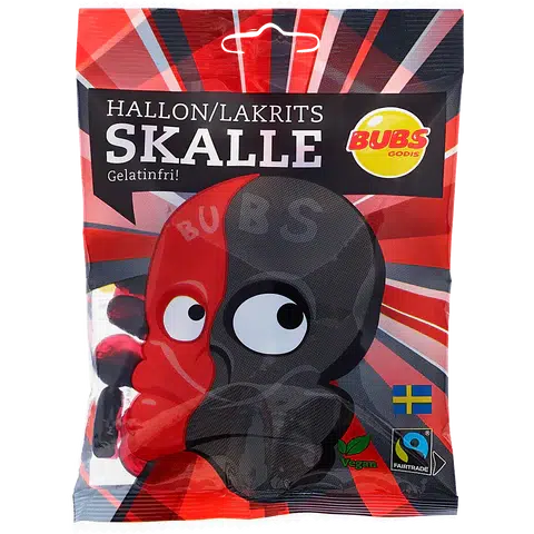הכירו את באבס סקאלה בשילוב טעמים שוודי קלאסי! סוכריות גומי בצורת גולגלת עם חצי אדום בטעם פטל וחצי שחור בטעם לקריץ - שילוב הטעמים הסקנדינבי המסורתי.באבס הלון/לקריץ סקאלה מציעות חוויה ייחודית עם שילוב טעמים המייצג את המסורת הסקנדינבית. החלק האדום מכיל טעם פטל מתוק ומרענן (Hallon), בעוד החלק השחור מעניק טעם לקריץ עמוק ומיוחד (Lakrits). הצורה המיוחדת של הגולגלת עם העיניים הלבנות יוצרת מראה חמוד ומושך. המוצר ללא ג'לטין, טבעוני ומקבל הסמכת סחר הוגן, המבטיח איכות ואחריות.