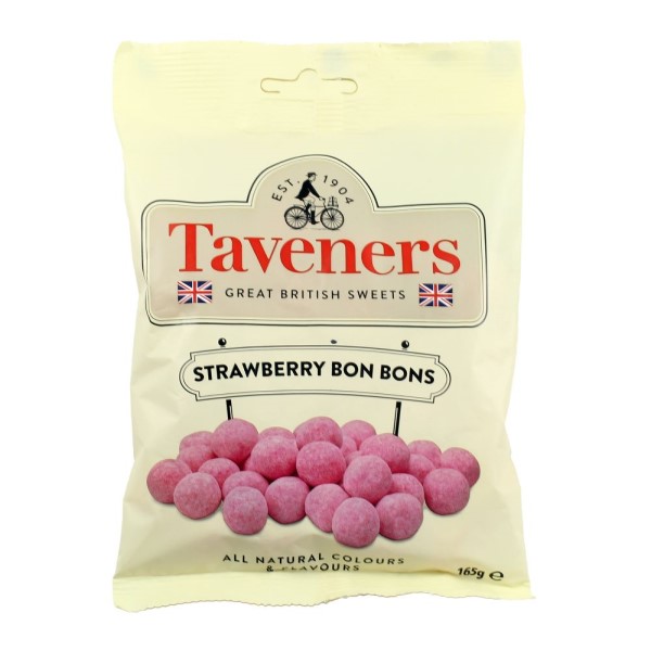 ממתקי בון בון בריטיים מסורתיים בטעם תות טבעי, בצורה עגולה קלאסית. המוצר מציע טעם תות עשיר ואותנטי עם מרקם קשה-רך נעים לעיסה. הממתקים עשויים מחומרי גלם טבעיים עם צבעים וטעמים טבעיים בלבד, מה שמבטיח חוויית טעם נקייה ואיכותית בגוונים ורודים יפהפיים של תות.