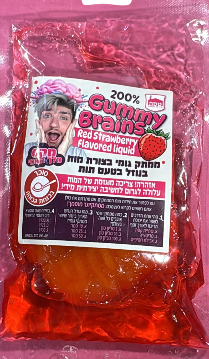 שקית גדולה של גומי מח נוזלי בטעם תות של טרנד. הגומי בעל מרקם רך ונוזלי מיוחד, עם טעם תות עז ומתוק. כל חתיכת גומי מכילה מילוי נוזלי מפתיע שמתפוצץ בפה ויוצר חוויית טעם ייחודית ומהנה. אריזה גדולה ומשתלמת עם פתח נוח לסגירה חוזרת. מושלם לחטיף, למסיבות, למתנות לילדים, או פשוט ליהנות מגומי מיוחד וטעים עם טעם פירות אהוב.