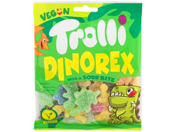 סוכריות גומי חמוצות בצורת דינוזאורים מסדרת Dino Rex של Trolli. שילוב כיפי של טעמי פירות מרעננים עם חמיצות עדינה ומרקם גומי רך וממכר. הסוכריות צבעוניות, משעשעות ומתאימות במיוחד לילדים וגם למבוגרים שאוהבים ממתקים עם אופי. ללא גלוטן, ללא לקטוז ומתאימות גם לטבעונים.
