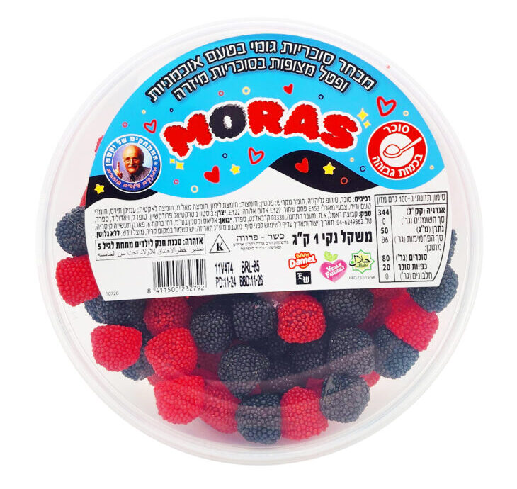 סוכריות גומי מוראס בטעם פטל ואוכמניות טבעיים! קערה גדושה של סוכריות רכות בצורת פירות יער בצבעים עזים - פטל אדום ואוכמניות שחורות. הסוכריות עשויות בטעמים אותנטיים ומציעות חוויית טעם מתוקה וענוגה. מושלמות לאירועים, מסיבות, קינוחים או פשוט ליהנות בכל רגע. בכשרות בד"ץ העדה החרדית. משקל נטו: 1 ק"ג בקערה גדולה נוחה עם סגירה מחדש.