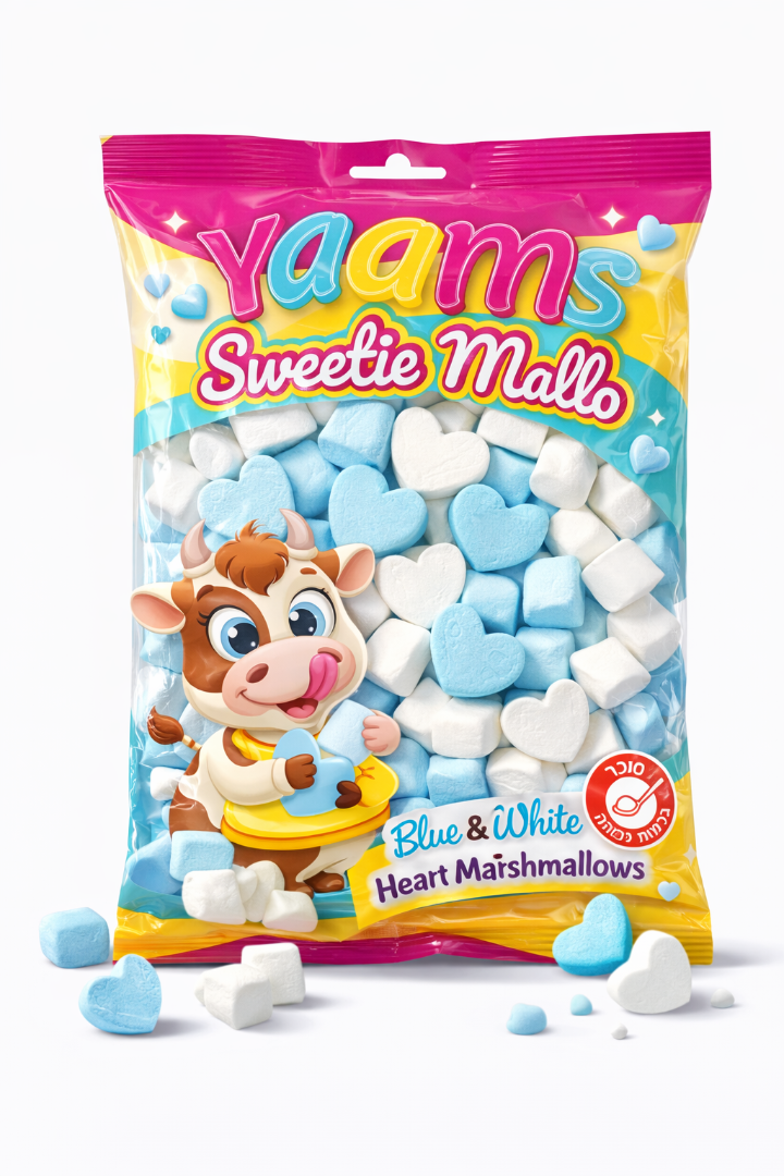 מרשמלו רך ואוורירי בצורת לבבות וקוביות בגווני כחול ולבן מבית Yaams. מתוק, כיפי ומושלם לנשנוש, לקישוט קינוחים, שוקו חם או מארזי מתנה. מרקם רך וטעם עדין שמתאים לילדים ולמבוגרים כאחד.